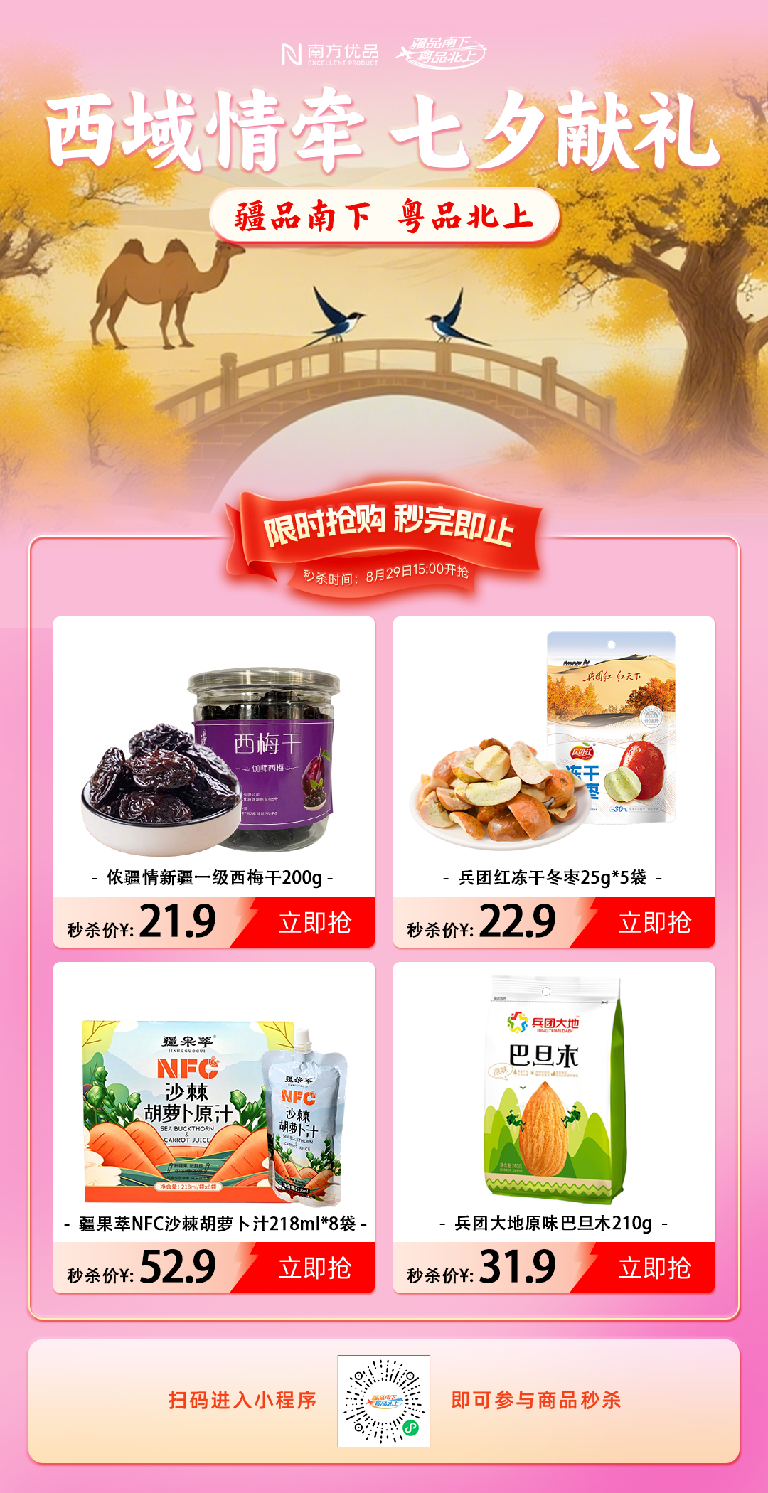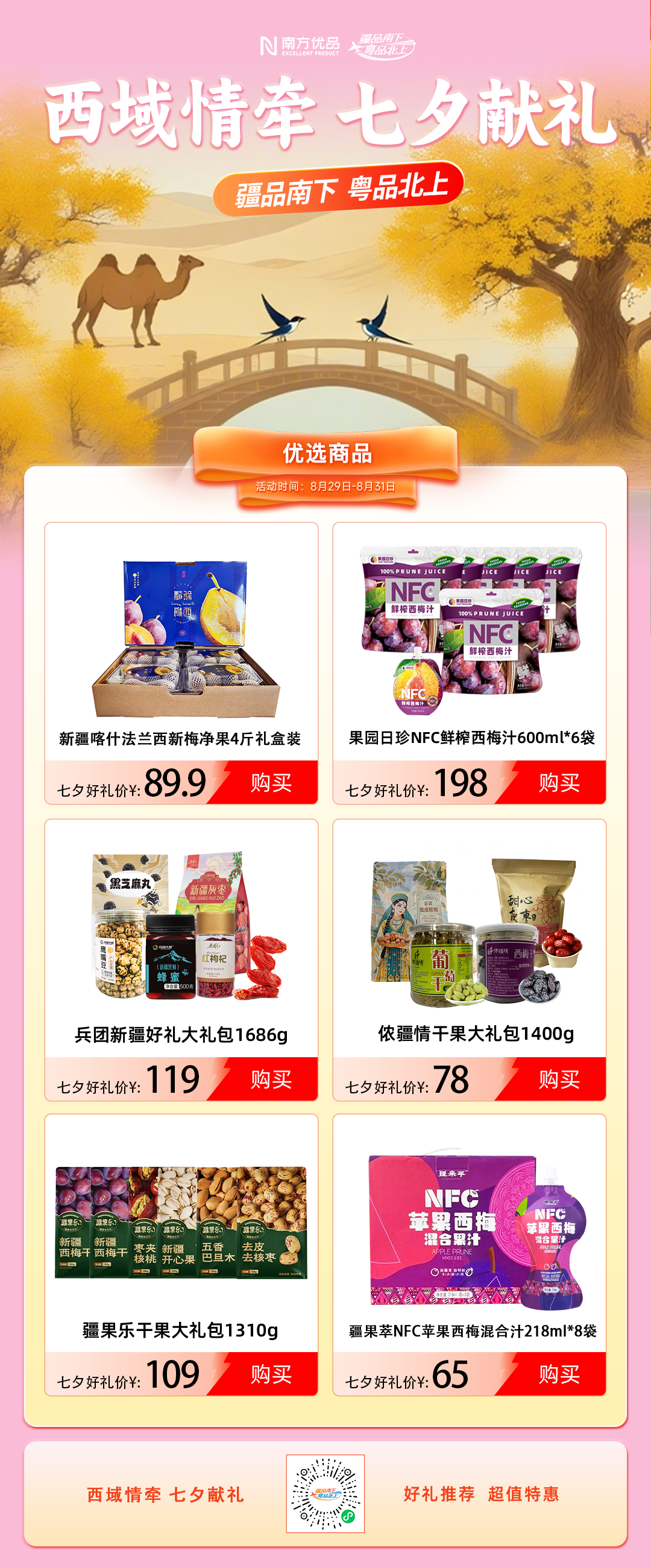 “金风玉露一再会,便胜却东说念主间大王人”,8月29日—31日,“疆品南下 粤品北上”线上主平台至极推出“西域情牵 七夕献礼”主题促销行动,以伽师新梅为媒,为湾区公共奉上最初5000公里的节日情意。