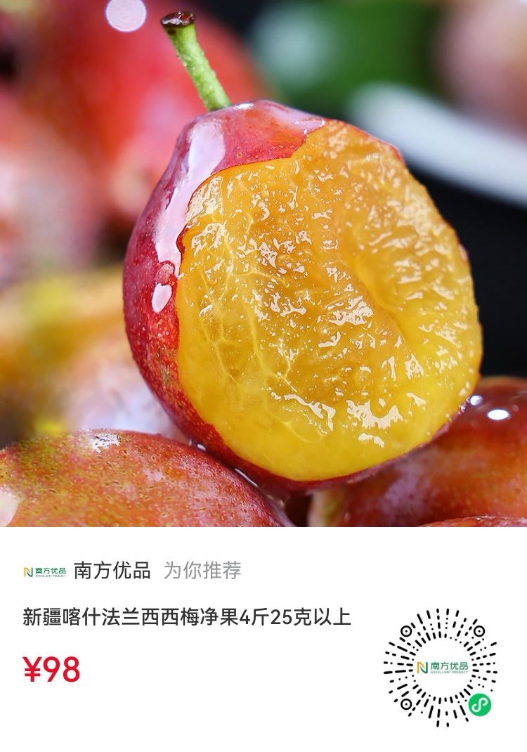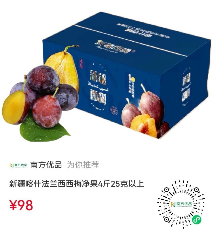 新疆喀什法兰西西梅 脆甜润滑 一口爆汁 4斤大果装(单果25g以上) 扫描下方二维码 即可下单 ▼